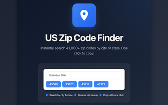การค้นหา Zipcode เป็นส่วนขยาย Chrome ฟรีที่ออกแบบมาเพื่อทำให้กระบวนการค้นหา zip code ของสหรัฐอเมริกาตามชื่อเมืองเป็นไปอย่างราบรื่น เครื่องมือนี้ช่วยให้ผู้ใช้สามารถค้นหา zip code ได้อย่างรวดเร็วเพียงแค่ป้อนชื่อเมือง ทำให้เป็นแหล่งข้อมูลที่มีค่าอย่างยิ่งสำหรับผู้ที่ต้องการข้อมูลไปรษณีย์ที่ถูกต้อง ด้วยอินเทอร์เฟซที่ใช้งานง่าย ผู้ใช้สามารถนำทางผ่านฟีเจอร์ต่างๆ ได้อย่างง่ายดายโดยไม่ต้องตั้งค่าหรือเรียนรู้ที่ซับซ้อน